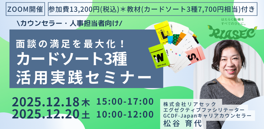 2009年のリリース以来、キャリア支援を担う多くの方からご好評をいただいている株式会社リアセックのカードソートシリーズを実践で十二分に活用頂くための学習プログラムです。