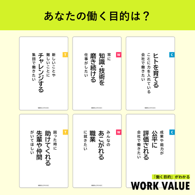 シゴトか、カイシャか、それともヒトか 「働く目的」がわかる自分がイキイキと楽しく働ける会社を選ぶための「採点項目」 WORK VALUE ポストする シェアする 販売価格: 3,300円(税込み) 会員価格 (税込み) 通常価格 (税込み) 在庫 商品コード cardsort-wv JANコード 数量 - + カートに入れる 入荷通知メールを希望する カテゴリー 自分がわかるカードソート 個別送料 0円 【内容物】WORKカード×13枚・TEAMカード×13枚・COMPANYカード×13枚|説明書 1部【製品仕様】ケースサイズ:93mm×63mm×15mmカードサイズ:88mm×58mm